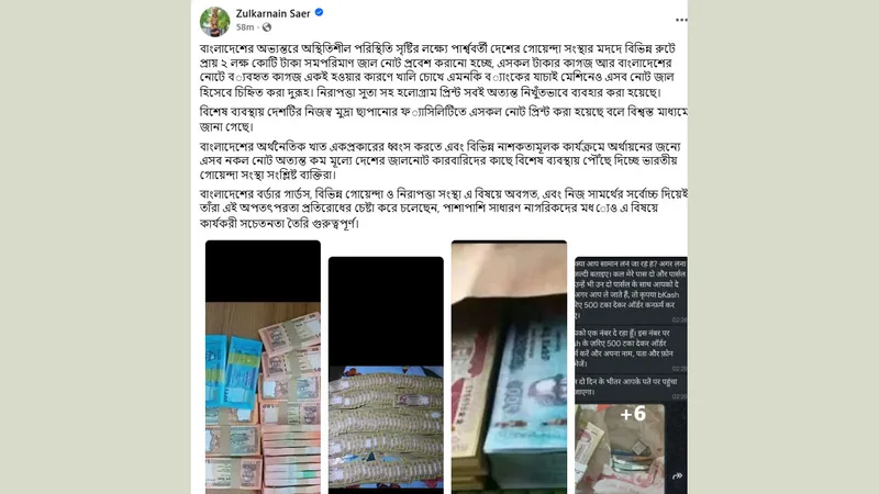 সাম্প্রতিক তথ্য অনুযায়ী, বাংলাদেশে দুই লাখ কোটি টাকার সমপরিমাণ জাল নোট প্রবেশের সম্ভাবনা দেখা দিয়েছে। বিষয়টি উন্মোচন করেছেন সুপরিচিত সাংবাদিক জুলকারনাইন সায়ের। তিনি বুধবার তার ভেরিফায়েড ফেসবুক পেজে একটি গুরুত্বপূর্ণ পোস্টে এ তথ্য জানান।