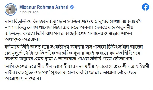 সাবেক প্রধানমন্ত্রী খালেদা জিয়ার অসুস্থতা ঘিরে দেশের রাজনীতিতে এক ধরণের অস্থিরতা বিরাজ করছে। এমতাবস্থায় জনপ্রিয় ইসলামী আলোচক মিজানুর রহমান আজহারীর এই দোয়া কামনা দেশের মানুষের মধ্যে এক মানবিক ঐক্যের বার্তা দিয়েছে। তাঁর পোস্টে বেগম জিয়াকে ‘দেশের তরে সীমাহীন ত্যাগ স্বীকার করা মহিয়সী নারী’ হিসেবে আখ্যায়িত করা এবং দলমত নির্বিশেষে সকলের দোয়া চাওয়া প্রমাণ করে যে, অসুস্থতা ও জীবনের সংকটে রাজনৈতিক পরিচয় গৌণ হয়ে যায়। দেশের মানুষ এখন এই বরেণ্য রাজনীতিবিদের দ্রুত রোগমুক্তি এবং সম্পূর্ণ সুস্থতা কামনা করছে। তাঁর চিকিৎসা কেমন মোড় নেয়, সেটাই এখন সকলের মনোযোগের কেন্দ্রবিন্দুতে।