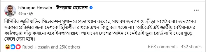 ইশরাক হোসেনের ক্ষুব্ধ প্রতিক্রিয়া শুধুমাত্র একটি রাজনৈতিক বক্তব্য নয়—এটি ক্রীড়াঙ্গনের একটি গভীর অসন্তুষ্টির প্রতিফলনও হতে পারে।